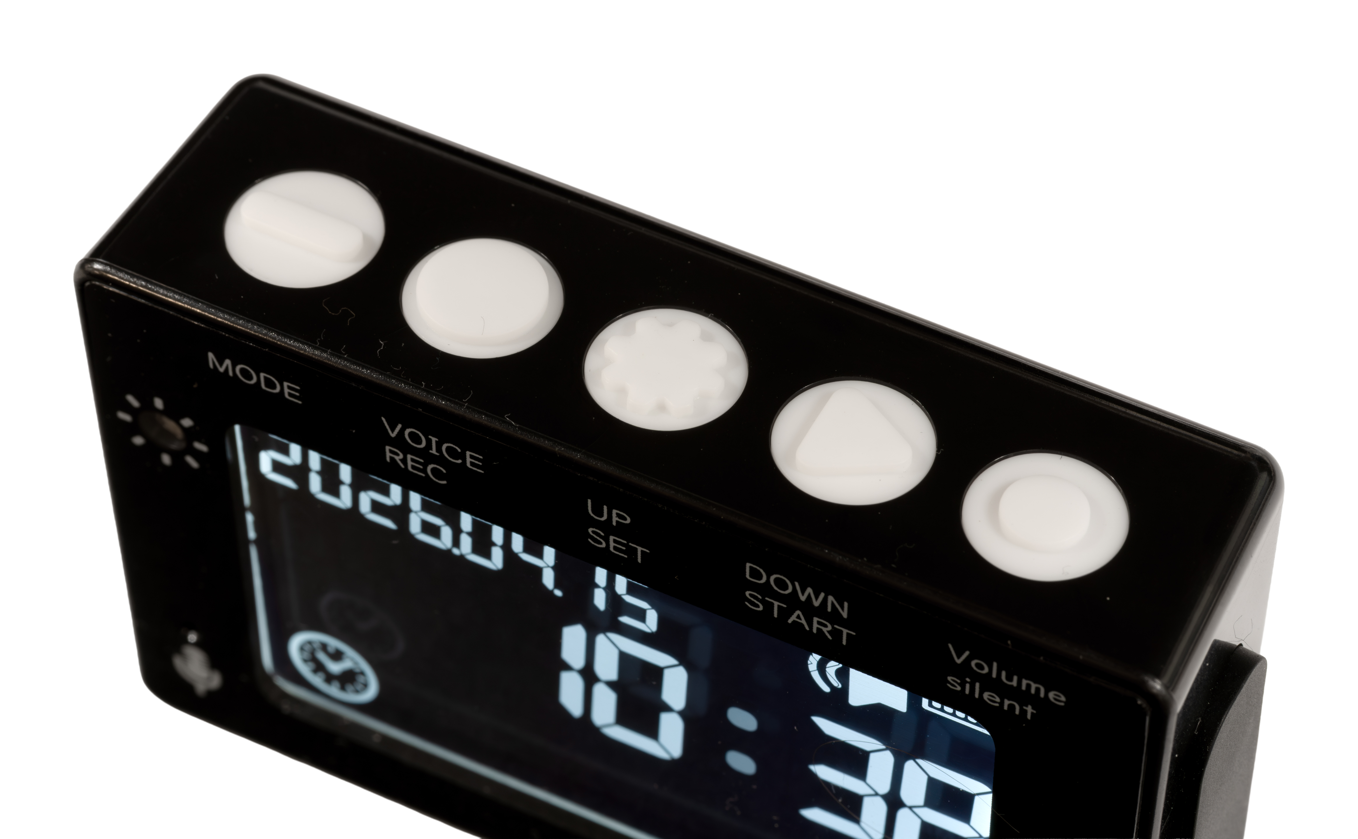 本製品は、時計・タイマー・アラーム・音声メモ録音・歩数計・照度計・防犯ブザーの7機能を1台に搭載したポータブルタイプの音声クロックです。 音声で情報を確認でき、ボタン部分はすべて異なる形状のため、触覚でも識別しやすい設計です。 本体は縦55×横83×厚さ24mm、重量約90gの手のひらサイズで、日本語と英語に対応しています。