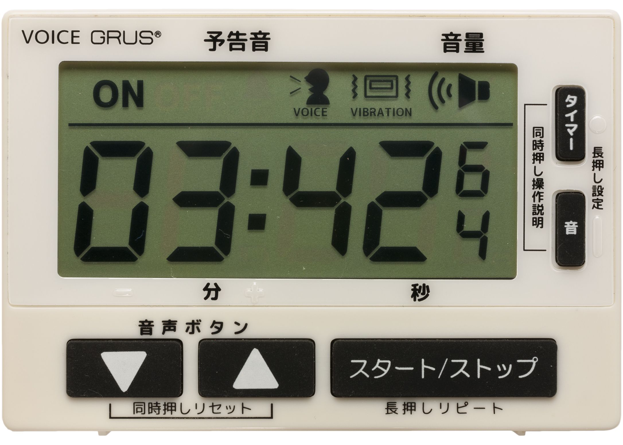 タイマーの機能は、カウントダウンタイマー、リピートタイマー、カウントアップタイマーの3種類です。音の機能は、音声か電子音が選択可能で、音とは別にバイブレーション機能が搭載されています。音量をオフにして、バイブレーションをオンにすることでバイブレーションのみで動作させることも可能です。 操作に困ったときは、タイマーと音のボタンを同時に押すと操作説明のアナウンスが流れます。