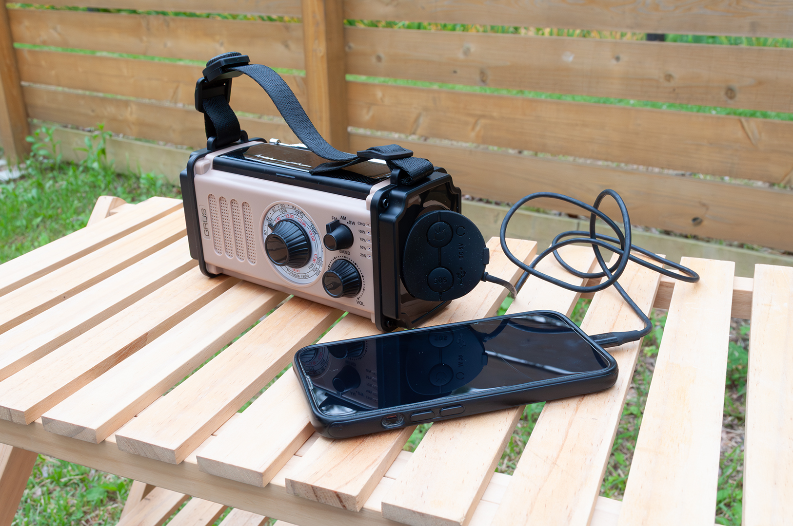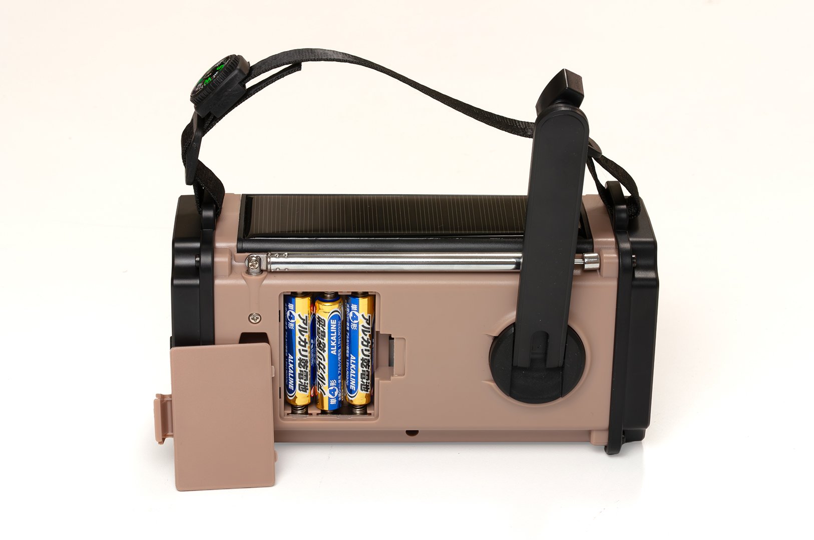 - USB Type-C充電(メイン)・単4形乾電池×3(サブ)・手回し充電(緊急時)・ソーラー充電(サポート)の4WAY
