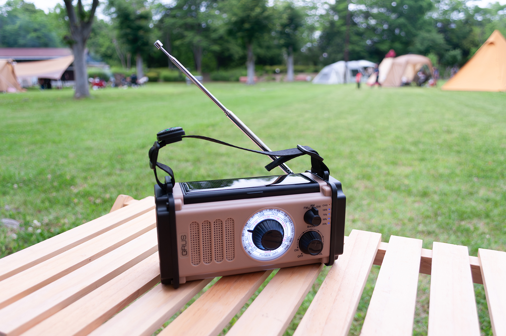 GRS303-SNDは、普段使いから非常時まで幅広いシーンで活躍します。普段は書斎やリビングに置いて、ラジオや読書灯として利用でき、落ち着いたデザインとコンパクトなサイズ感でインテリアにも自然に溶け込みます。夜間の手元灯や、就寝前の読書灯としても便利で、スマートフォンのモバイルバッテリーとしても役立つため、日常の中で無理なく備えることができます。 災害時には、停電や通信障害に備えて、情報収集手段としてのラジオや、明かりの確保、SOSアラートによる緊急発信、モバイル機器の充電など、必要な機能を1台でまかなうことができ、乾電池・手回し・ソーラーといった複数の電源方式により電力供給も確保されます。非常持ち出し袋や玄関収納など、いざというときにすぐ手が届く場所への常備もおすすめです。 また、防水性能や照明機能を活かして、キャンプや車中泊などのアウトドアシーンでも活躍。夜間の照明やスマートフォンの充電などに便利で、災害対策だけでなく“暮らしを広げる”アイテムとしてもご利用いただけます。