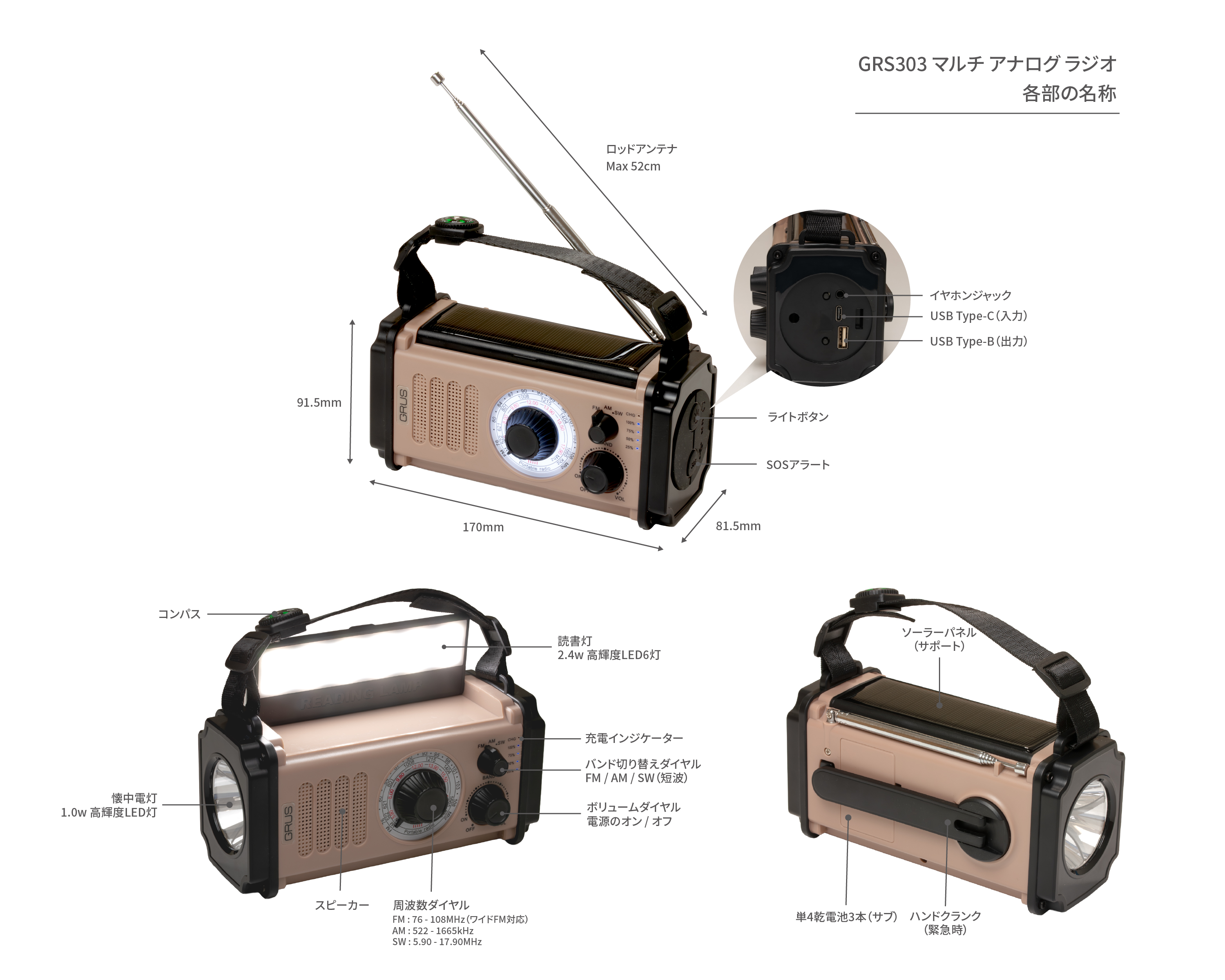 GRS303-SNDは、防災と日常の両方で活躍する多機能ラジオとして、必要な機能を1台に凝縮しています。ワイドFMを含むFM/AM/短波(SW)に対応したラジオ機能に加え、高輝度LEDを採用した懐中電灯と6灯の読書灯を搭載し、停電時や夜間の照明としても心強い存在です。 さらに、約90dBの警報音と点滅ライトによるSOSアラート機能を備え、緊急時の居場所の知らせや警告にも使用可能です。内蔵バッテリーは大容量の10,000mAhで、スマートフォンを約2回充電することができ、情報収集手段の確保にも役立ちます。 電源は、USB Type-C充電に加え、乾電池、手回し充電、ソーラー充電の4WAY対応。さまざまな状況でも電力を確保できるよう設計されています。防水性能はIPX3相当(カバー装着時)で、アウトドアや屋外での使用にも配慮。重さは約540gと軽量で持ち運びやすく、設置場所を選びません。 操作性にもこだわり、昔ながらのダイヤル式を採用。感覚的に操作できるため、どの年代の方にも扱いやすく、高齢者の方にも安心してご利用いただけます。 また、段ボール調のパッケージは本体カラーと調和し、ギフトや販促用にも適した仕様となっています。細部に至るまで実用性と安心感を追求した、暮らしに寄り添う一台です。